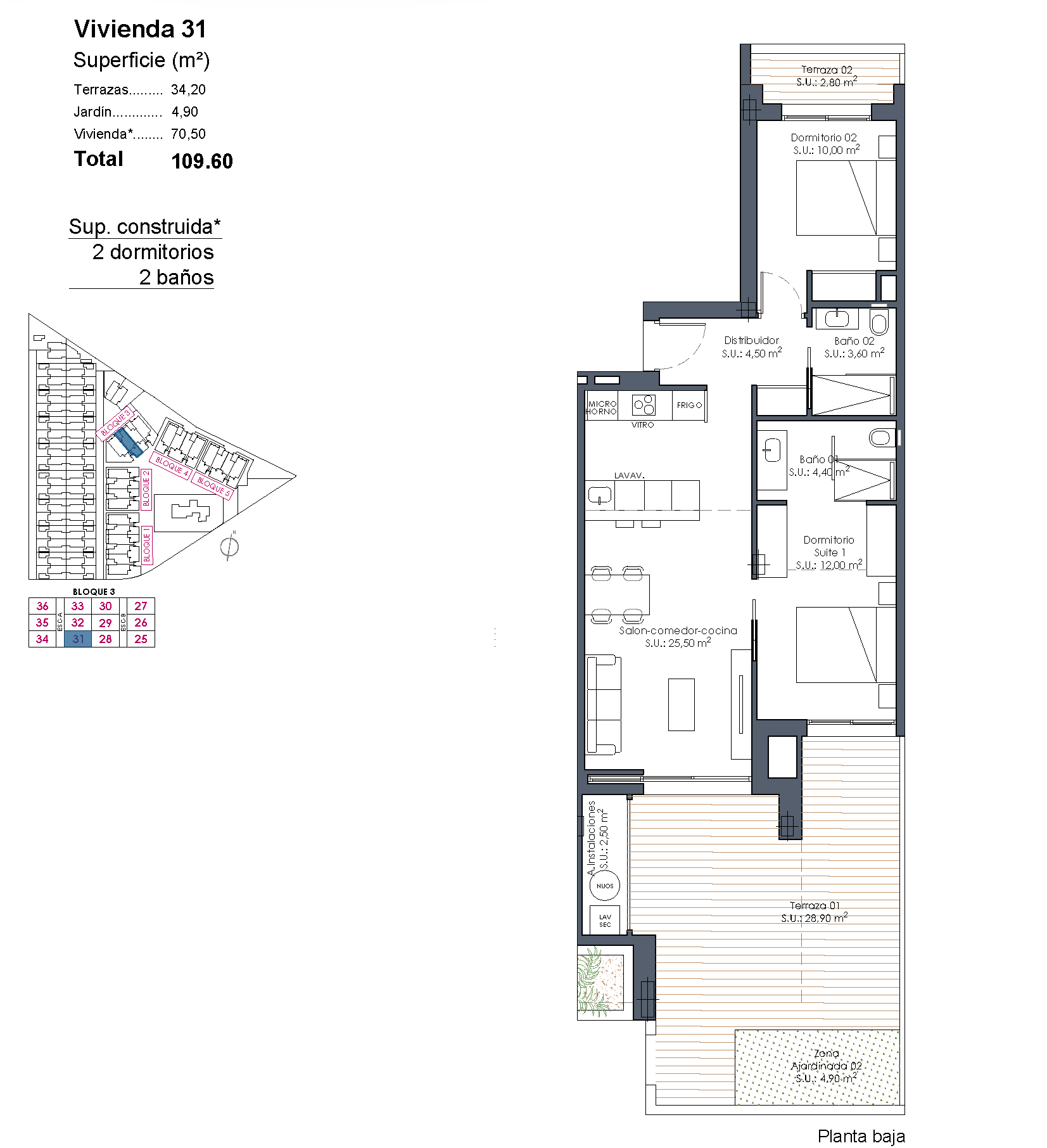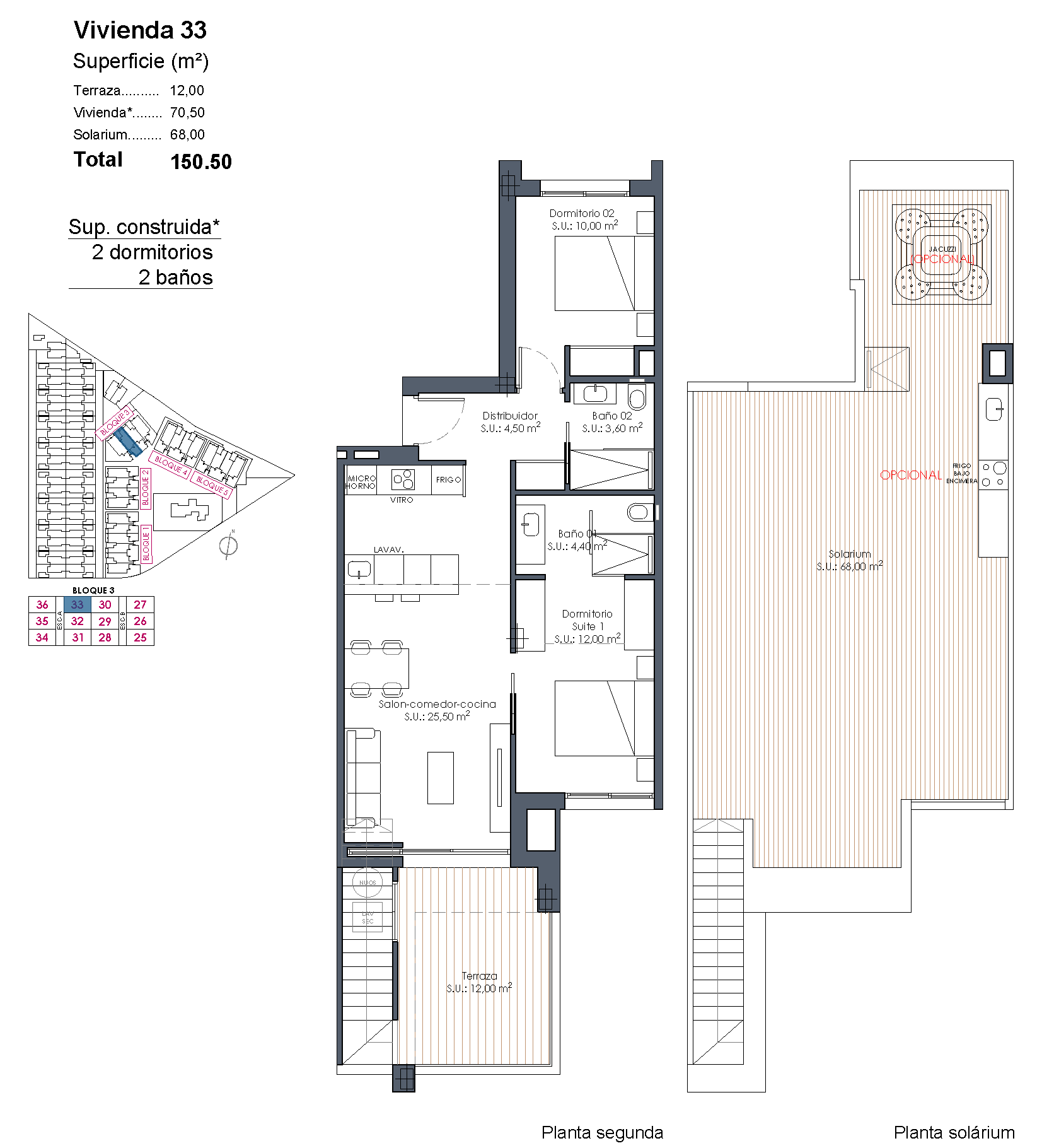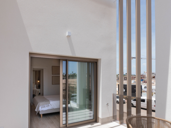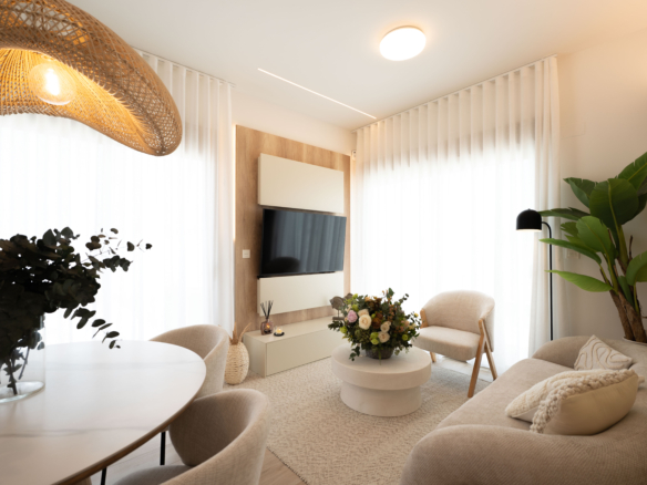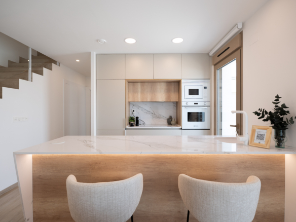 De appartementen zijn ontworpen voor dagelijks gemak én een moderne uitstraling. De keukens worden compleet uitgerust opgeleverd, inclusief inbouwapparatuur, en de woningen beschikken over airconditioning via kanalen, gemotoriseerde rolluiken, aluminium schuiframen met thermische onderbreking en dubbele beglazing. Ook de badkamers zijn compleet afgewerkt met meubels, spiegels, douchewanden en hoogwaardige materialen. Bepaalde bovenwoningen beschikken daarnaast over een groot solarium met voorbereiding voor jacuzzi en optioneel een buitenkeuken.