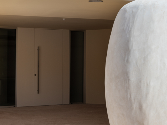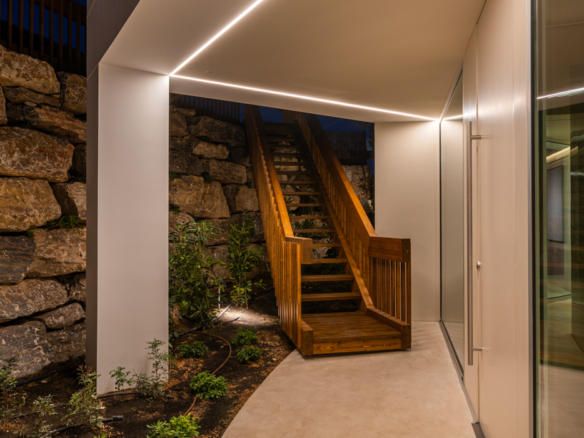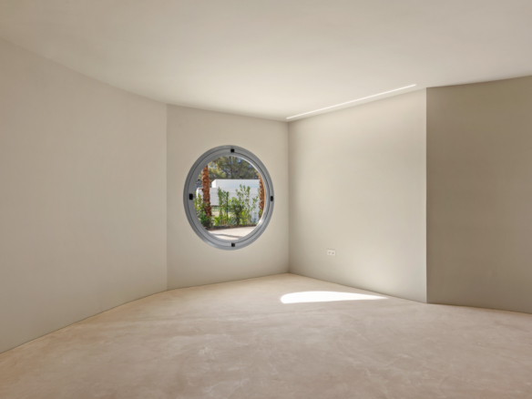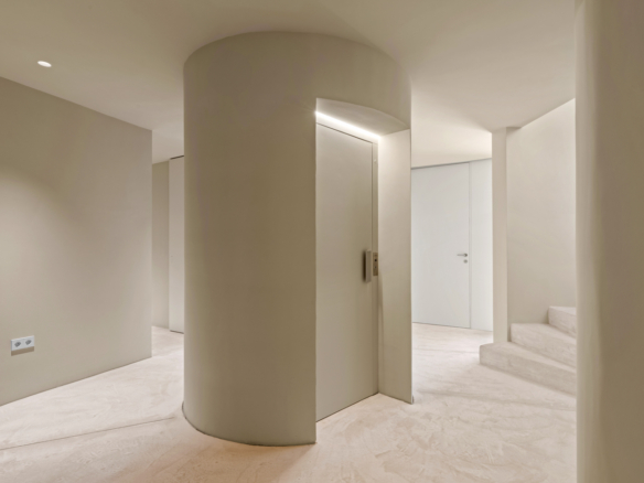 Op de half-verzonken verdieping vormen golvende muren de contouren van binnen-, buiten- en zwembadruimtes. Dit verlicht de structurele belasting door een verhoogde energietransfer via het oppervlak dat in contact staat met de buitenomgeving. Deze vloeiende ruimtes creëren de beleving van wonen binnen een gladde rots en fungeren tegelijkertijd als energieaccumulator.