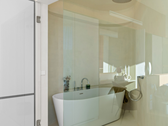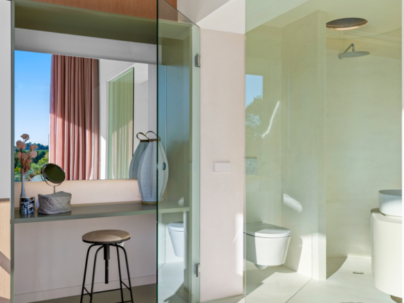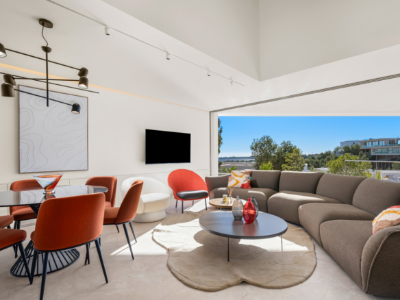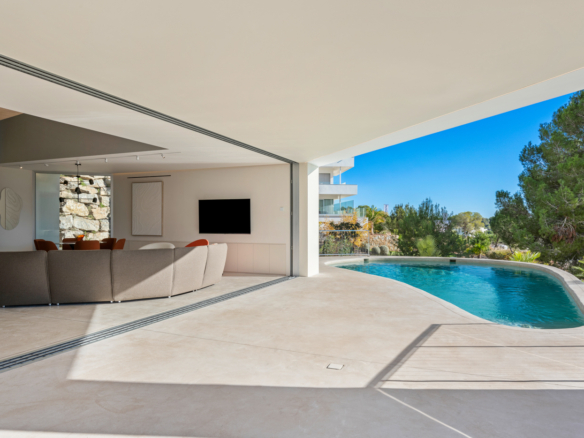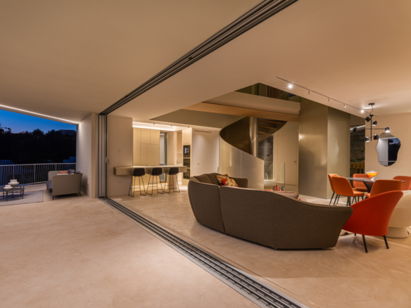 De bovenverdieping herbergt de woonkamer, keuken en het zwembad, samengebracht in een geheel dat wordt gescheiden door intrekbare scheidingswanden. Deze bieden eindeloze mogelijkheden om de omgeving aan te passen, waardoor binnen-, semi-buiten- en buitenleven naadloos in elkaar overlopen.