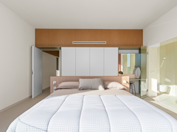 Een robuuste draadframe-structuur die kamers en privéruimtes omvat. Met een 45º gedraaide lay-out binnen het structurele raamwerk kijken de kamers naar buiten door twee grote openingen, waardoor elke ruimte twee oriëntaties heeft. Schuifbare houten panelen en lichtregulerende elementen bewegen langs de gevel, waardoor de sfeer wordt gecreëerd door ofwel al het licht te blokkeren of tot 50% van het oppervlak open te stellen voor de omringende natuur.