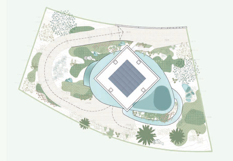 Op de half-verzonken verdieping vormen golvende muren de contouren van binnen-, buiten- en zwembadruimtes. Dit verlicht de structurele belasting door een verhoogde energietransfer via het oppervlak dat in contact staat met de buitenomgeving. Deze vloeiende ruimtes creëren de beleving van wonen binnen een gladde rots en fungeren tegelijkertijd als energieaccumulator.