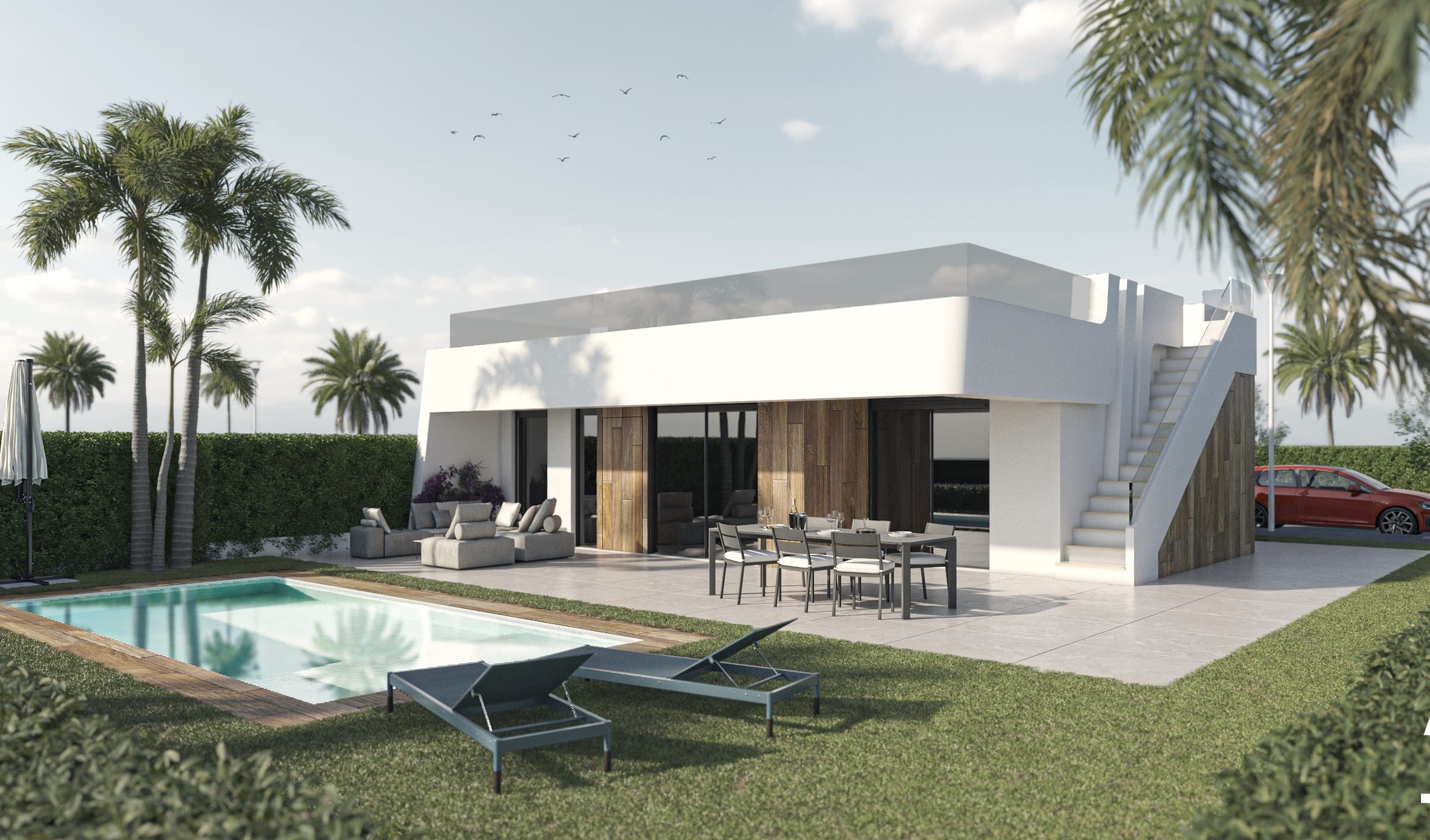 Op een perceel van 362 m2, met terras van 11 m2, tuin van 250 m2, dakterras van 94 m2 en zwembad van 16 m2.
